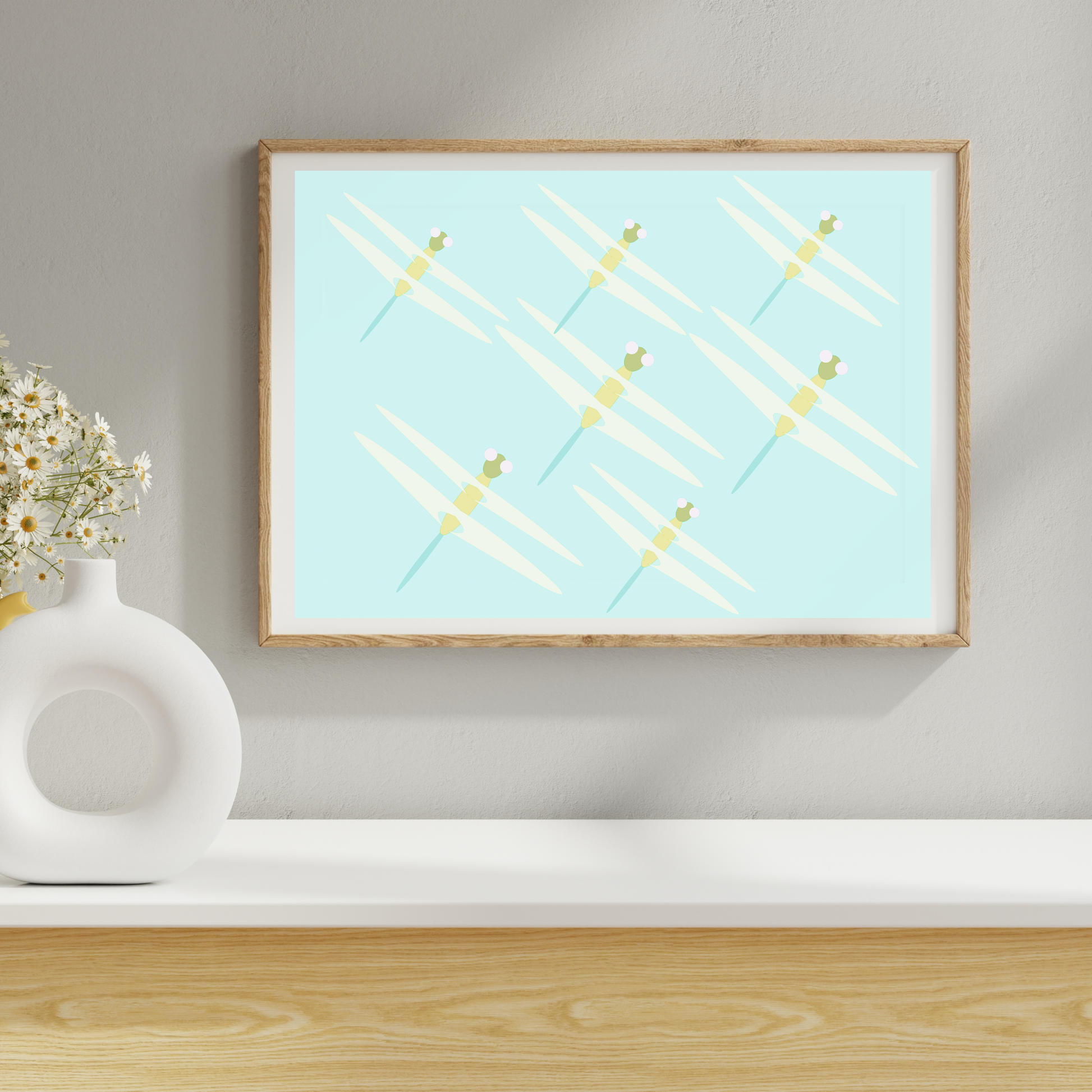 This light and airy design features a pattern of pale yellow and green dragonflies with translucent wings, set against a soft sky-blue background. The minimalist composition and soothing colors aim to evoke a sense of calm and flight.